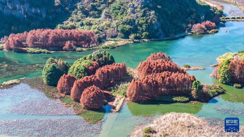 12月16日,云南省文山壮族苗族自治州丘北县普者黑国家湿地公园层林尽染景色美如画(无人机照片)。