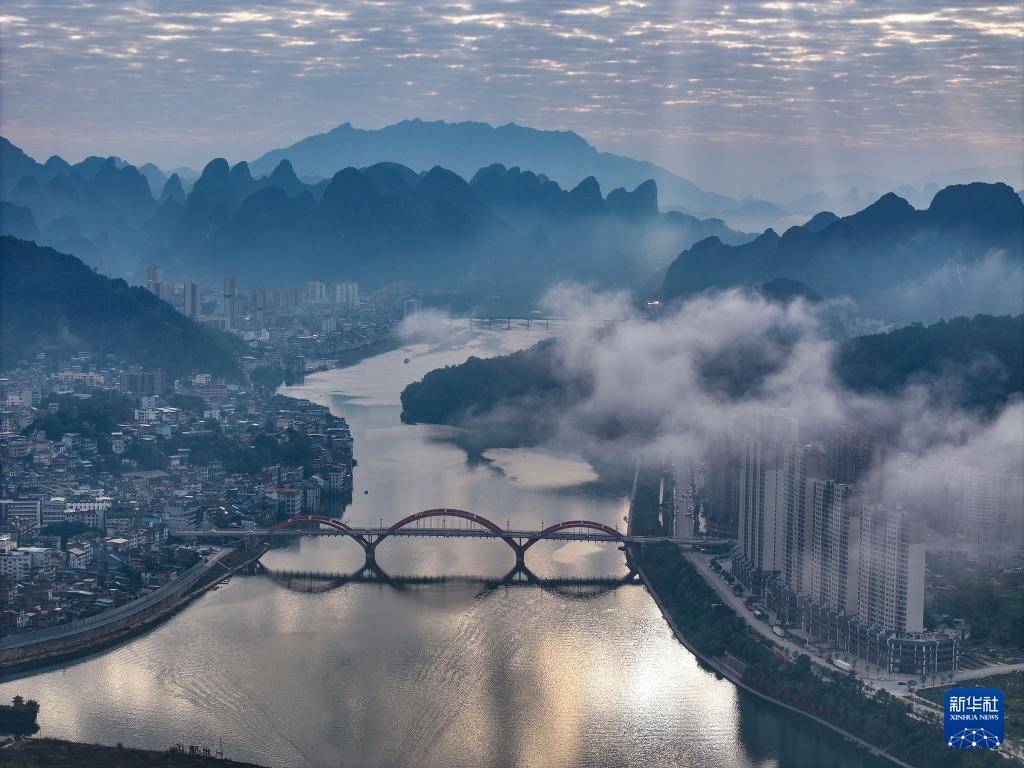 12月15日拍摄的广西平乐县城“三江口”晨曦(无人机照片)。