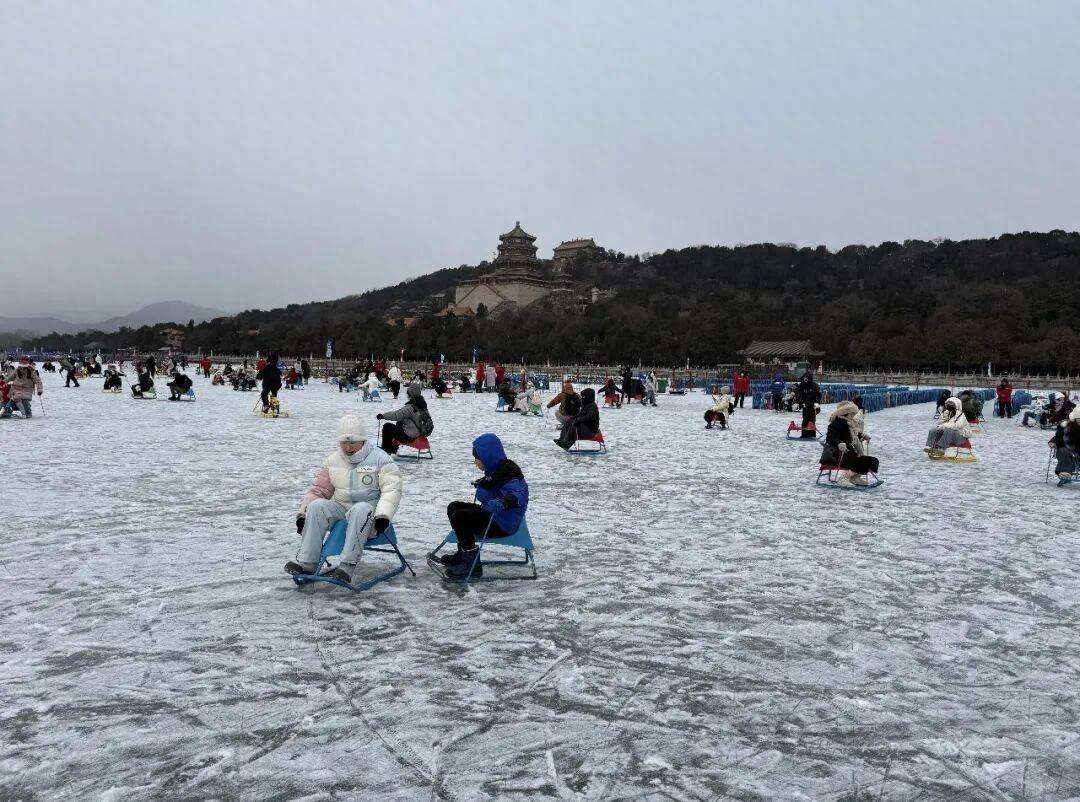 从高空俯瞰,颐和园冰面如同一块灰白色的玉石,镶嵌在冬日的园林画卷中。万寿山的黛色山影和美轮美奂的佛香阁,成了冰友拍照的绝美背景板。偌大的冰场上,游人像一个个小黑点,以缓慢的速度流动,在冰面上划出交错的弧线。“密密麻麻全是人,给本南方人小小的震撼。”一位南方网友感叹。